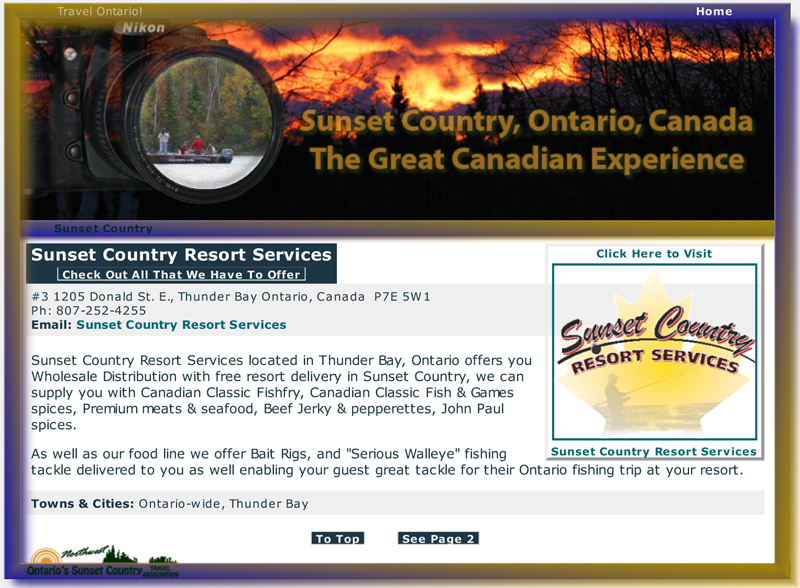 Sunset Country is the region's travel & tourism promotion organization and their slogan is "The Great Canadian Experience". They've got a nice slogan, but I don't know if I'd call dealing with Al Sebastian a great Canadian experience. Al's also changed his promotional angle, he's now promoting himself as "Sunset Country Resort Services" although as you can see from this screen capture of their website it all points back to Canadian Classic Fishfry and Canadian Classic Food Products. Spreading the joy...